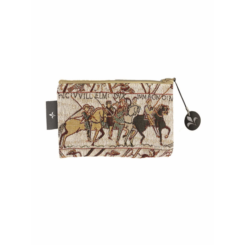 Cette pochette jacquard est un extrait de la célèbre tapisserie de la reine Mathilde, aujourd'hui au musée de Bayeux en Normandie. Elle semble avoir été commandée par Odon de Bayeux, le demi-frère de Guillaume le Conquérant, et décrit les faits relatifs à la conquête normande de l'Angleterre en 1066.